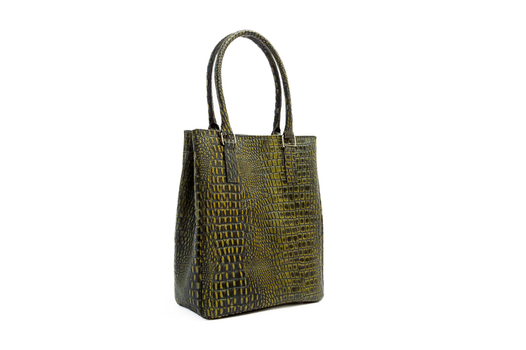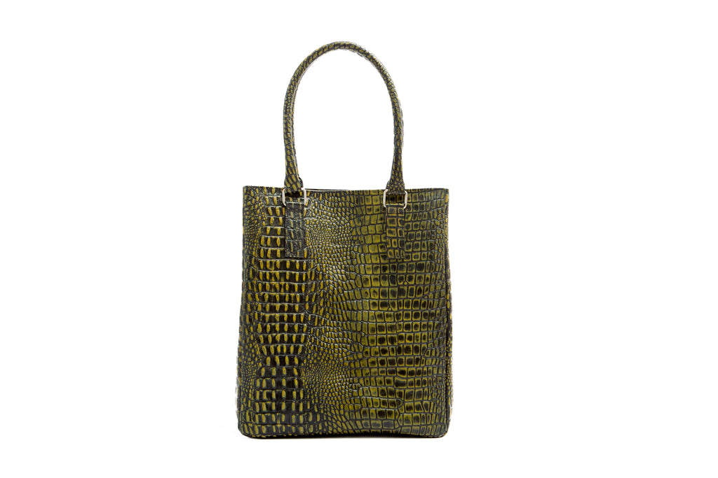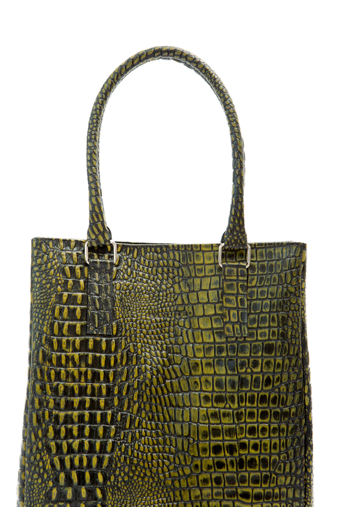 Bolso de mano hecho a mano artesanalmente en piel de vaca con efecto croc. Incluye dos agarraderas de piel y detalles de níquel pulido. El interior es de algodón e incluye un parche con el logo impreso por medio de presión. Adicional, en el interior incluye bolsillo abierto con logo estampado.