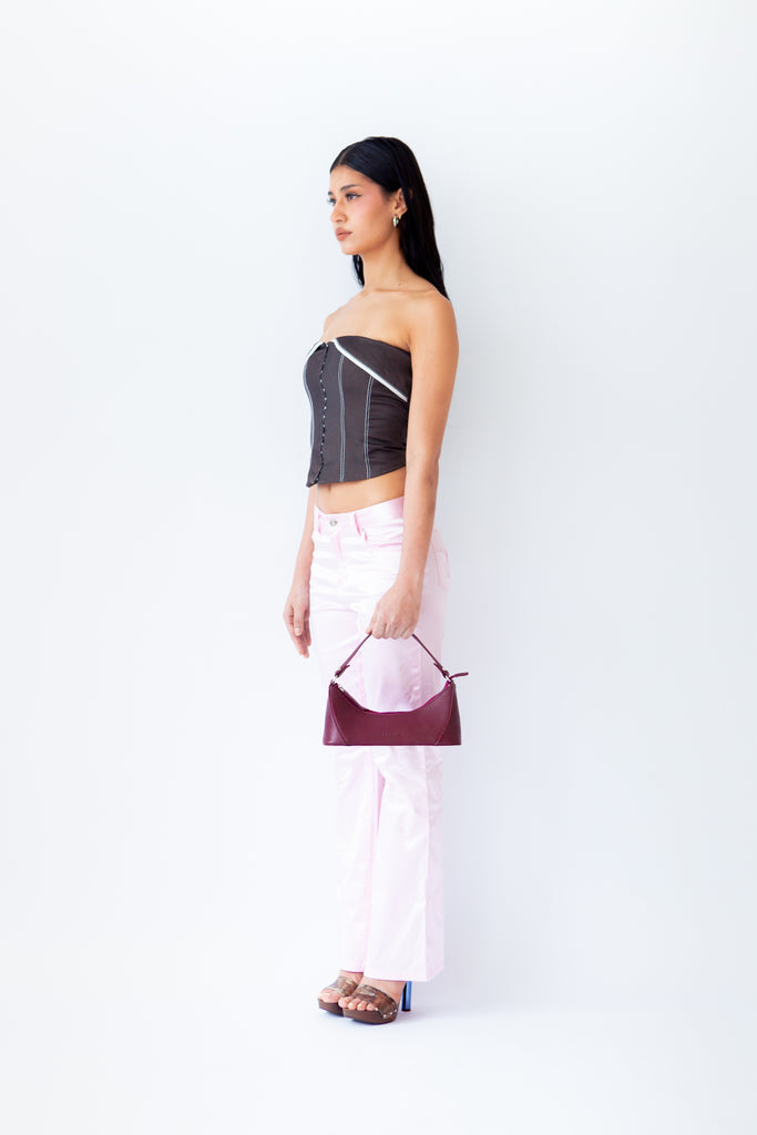 Bolso de hombro con estructura única confeccionado en cuero de vaca. Cada pieza incluye una agarradera fija y costuras a tono. Zipper de nylon con detalles en acero inoxidable. Logo embozado en el exterior. El interior incluye un tag con logo a tono con el forro.